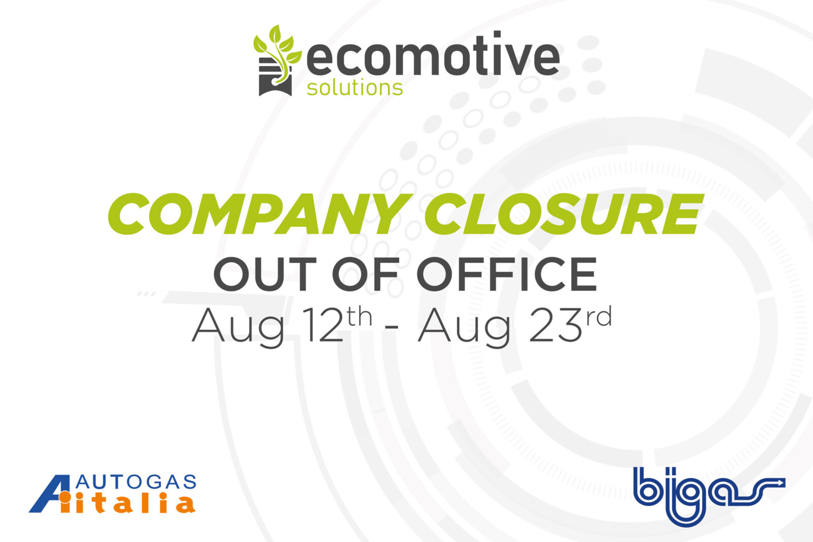 Ecomotive Solutions will be closed for summer vacation from August 12th to August 23rd. We will resume operations on August 26th.